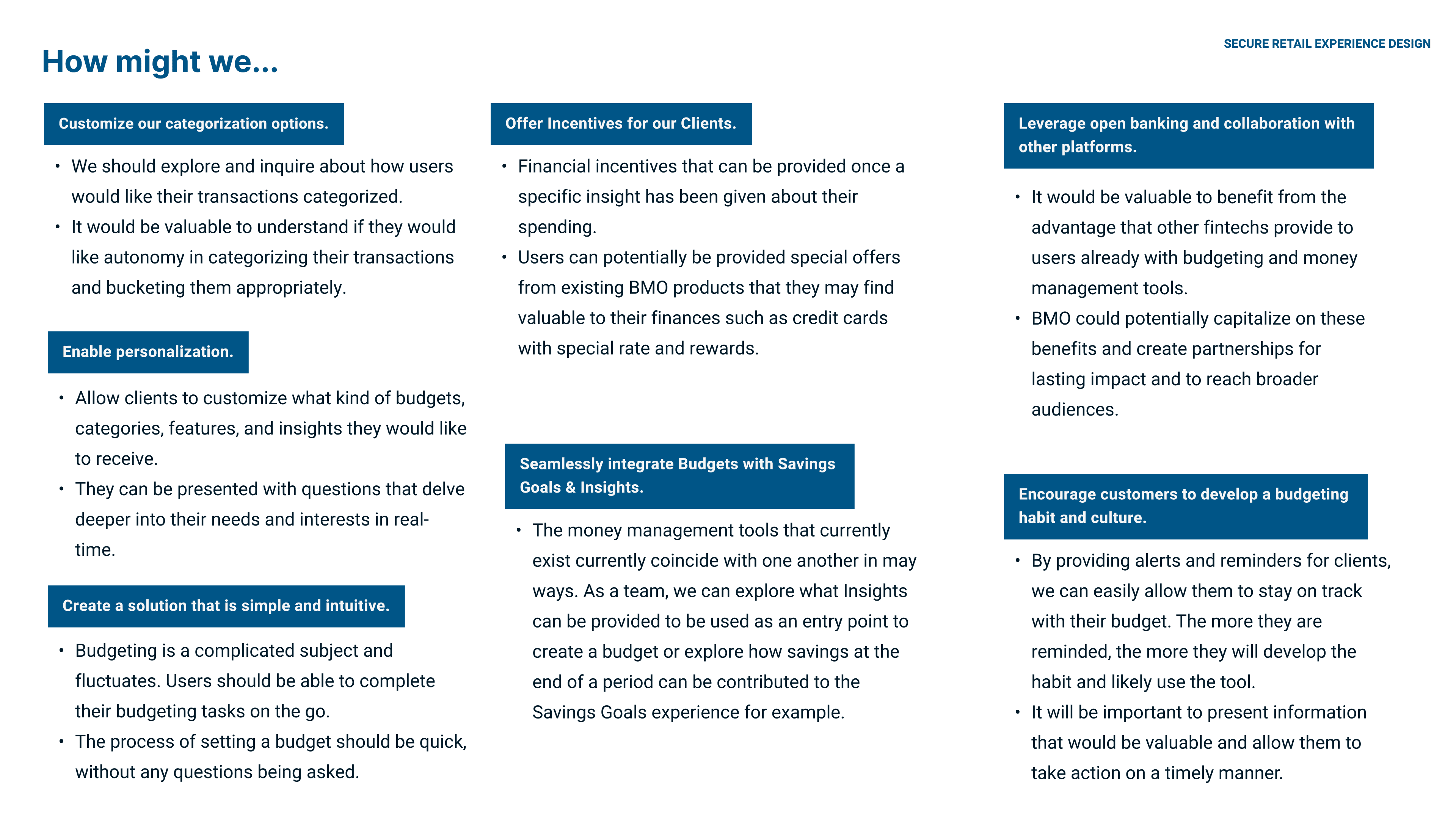BMO lacked a native budgeting solution, limiting its ability to compete with challenger banks and fintech apps. Our opportunity: deliver a personalized, intuitive, and integrated budgeting feature to increase digital engagement, product adoption, and customer satisfaction.