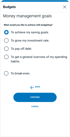 Users select their primary budgeting motivation — achieving savings goals, growing investments, paying off debt, understanding spending habits, or simply breaking even. This step personalizes the experience and feeds into future recommendations. The radio button pattern keeps selection fast and unambiguous, aligning with our workshop priority of keeping setup "simple and intuitive" so users can complete it on the go.