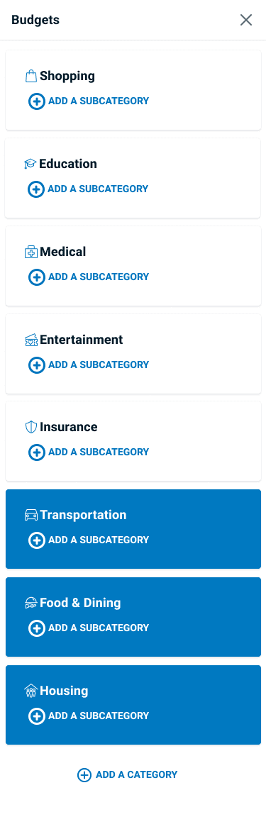 Budget cycle, account selection, and category-level customization with smart defaults based on spending history.