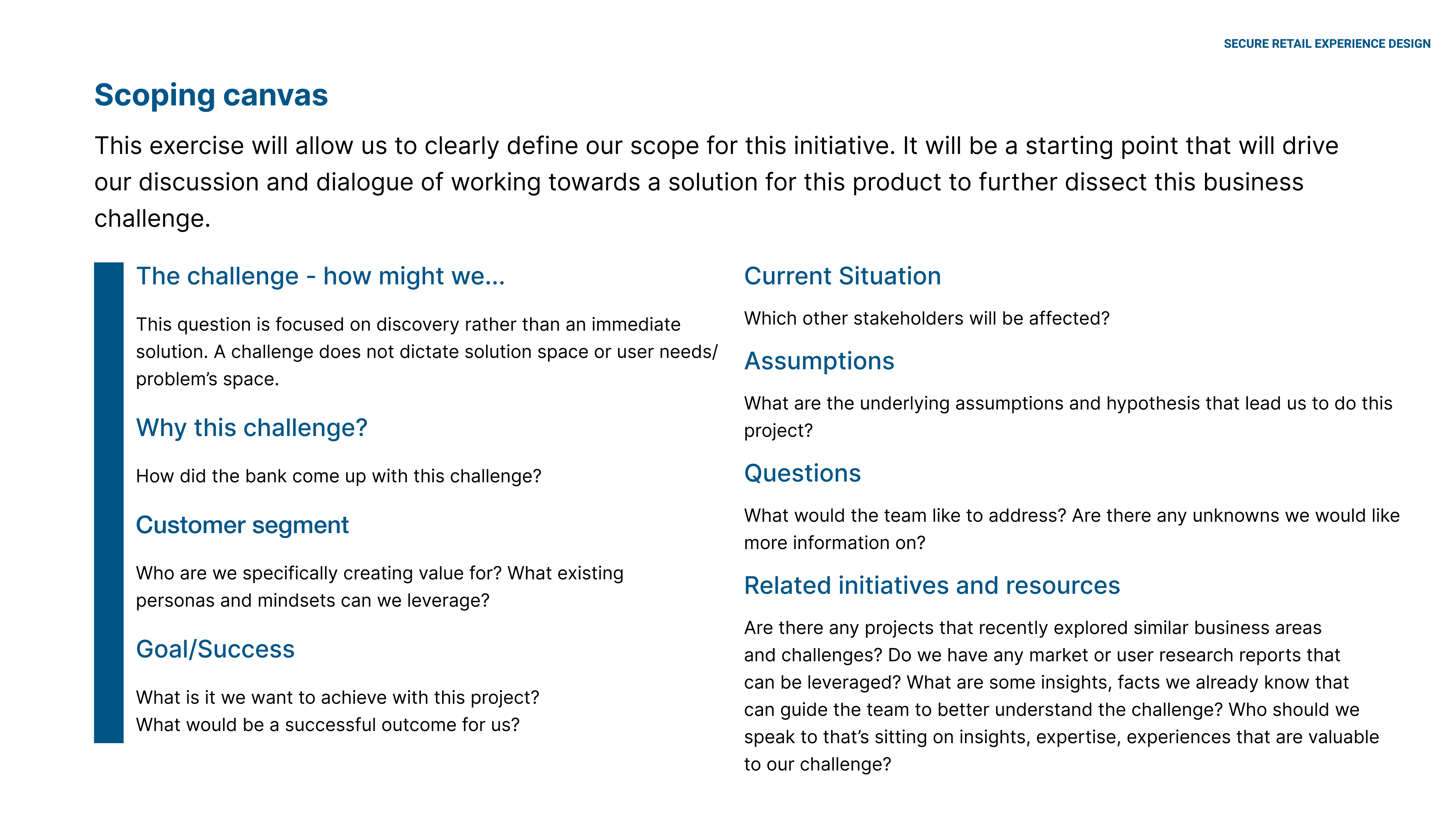 To define our scope, we used a Scoping Canvas — a structured exercise that drove dialogue around the business challenge. The team collaboratively answered critical questions including: "How might we..." challenge framing, customer segmentation, goal and success definitions, assumptions, and related initiatives. This served as the foundational artifact that all subsequent activities built upon.