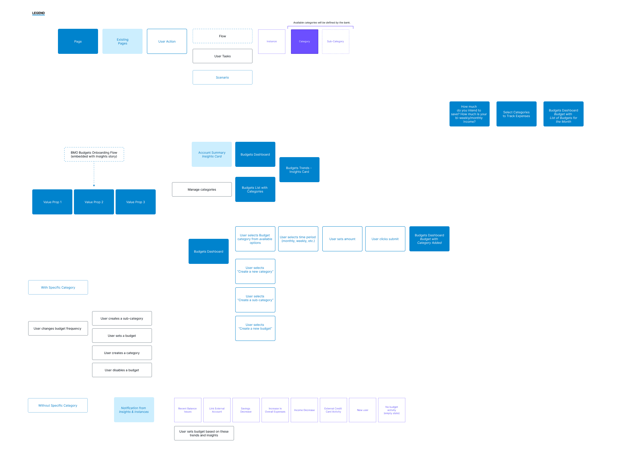 I initiated design explorations based on real-world financial flows, mapping out the complete user journey from the Account Summary entry point through budget creation, category selection, and ongoing management. Key questions guided the exploration: