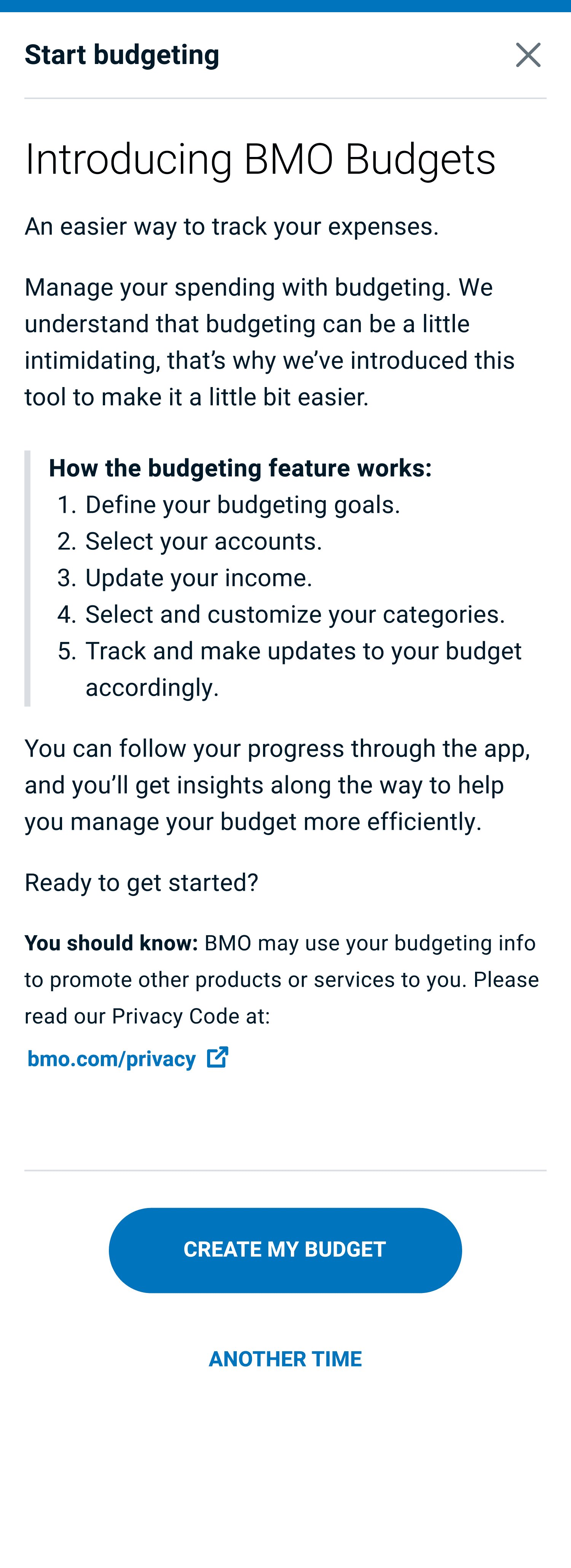 When users tap "Start Budgeting," a takeover modal introduces the feature with a clear value proposition: "An easier way to track your expenses." The screen explains how budgeting works in five simple steps — define goals, select accounts, update income, customize categories, and track. This transparency was a direct response to research showing that budgeting tools often feel intimidating. The callout box and ordered list reduce cognitive load, while the privacy disclaimer builds trust — critical in a banking context.