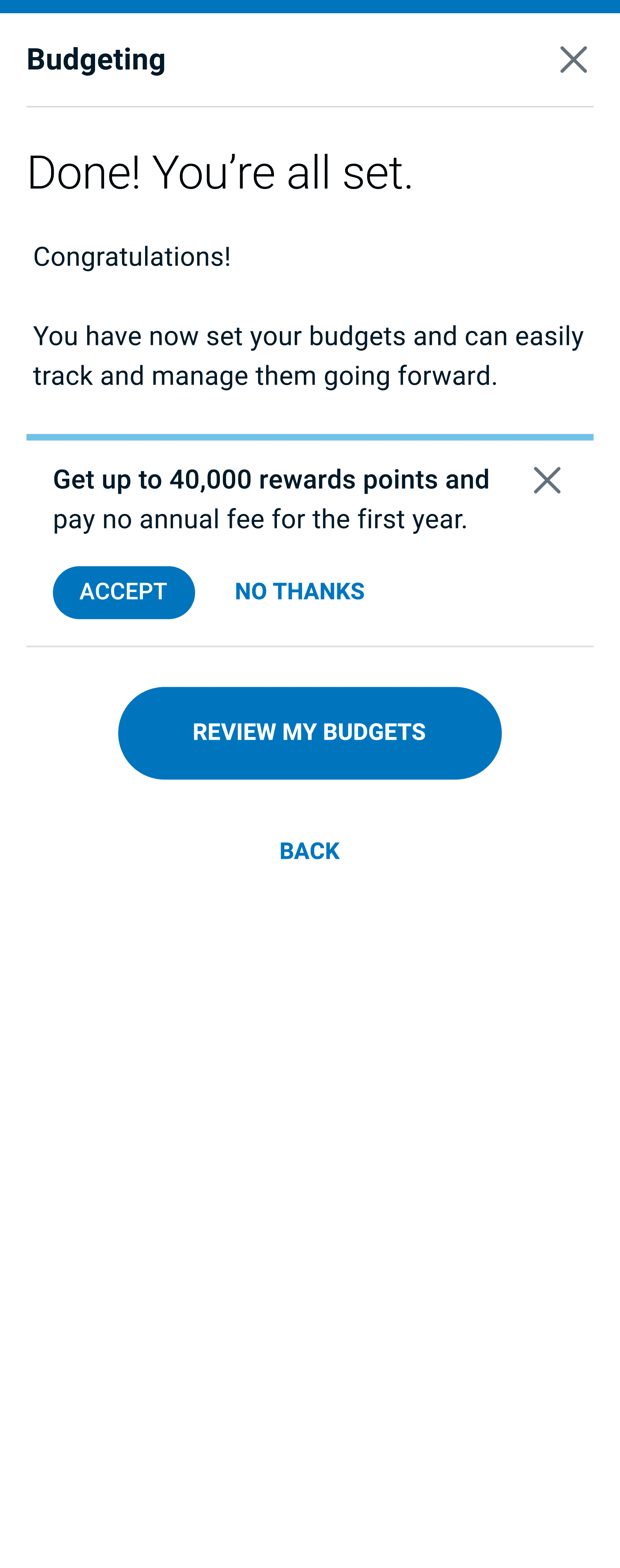 Once budgets are set, users see a confirmation screen summarizing their active categories with set amounts. This moment of accomplishment was designed to reinforce the habit-forming loop our workshop identified. The screen also surfaces a contextual cross-sell offer — in this case, a credit card rewards promotio.