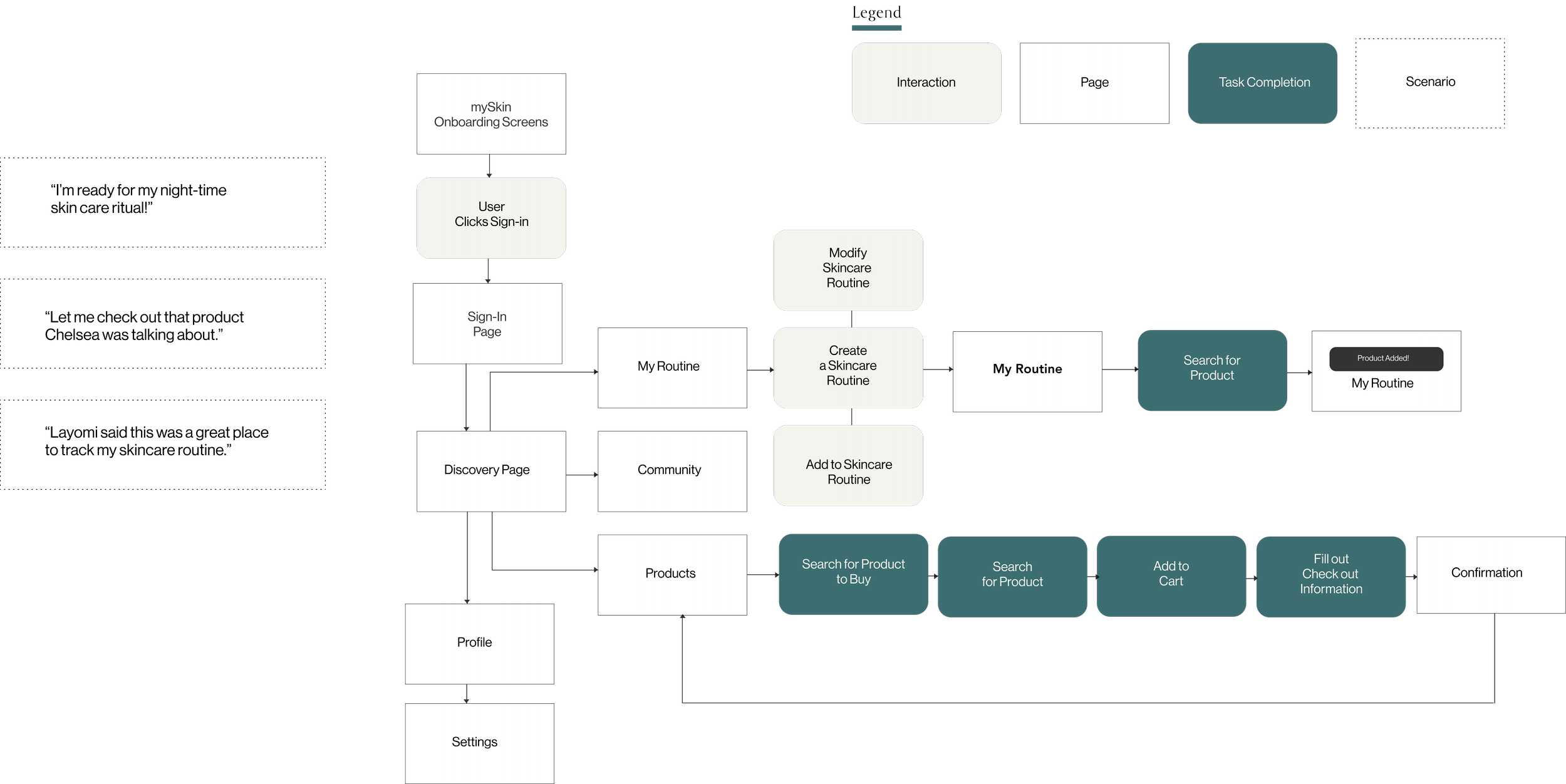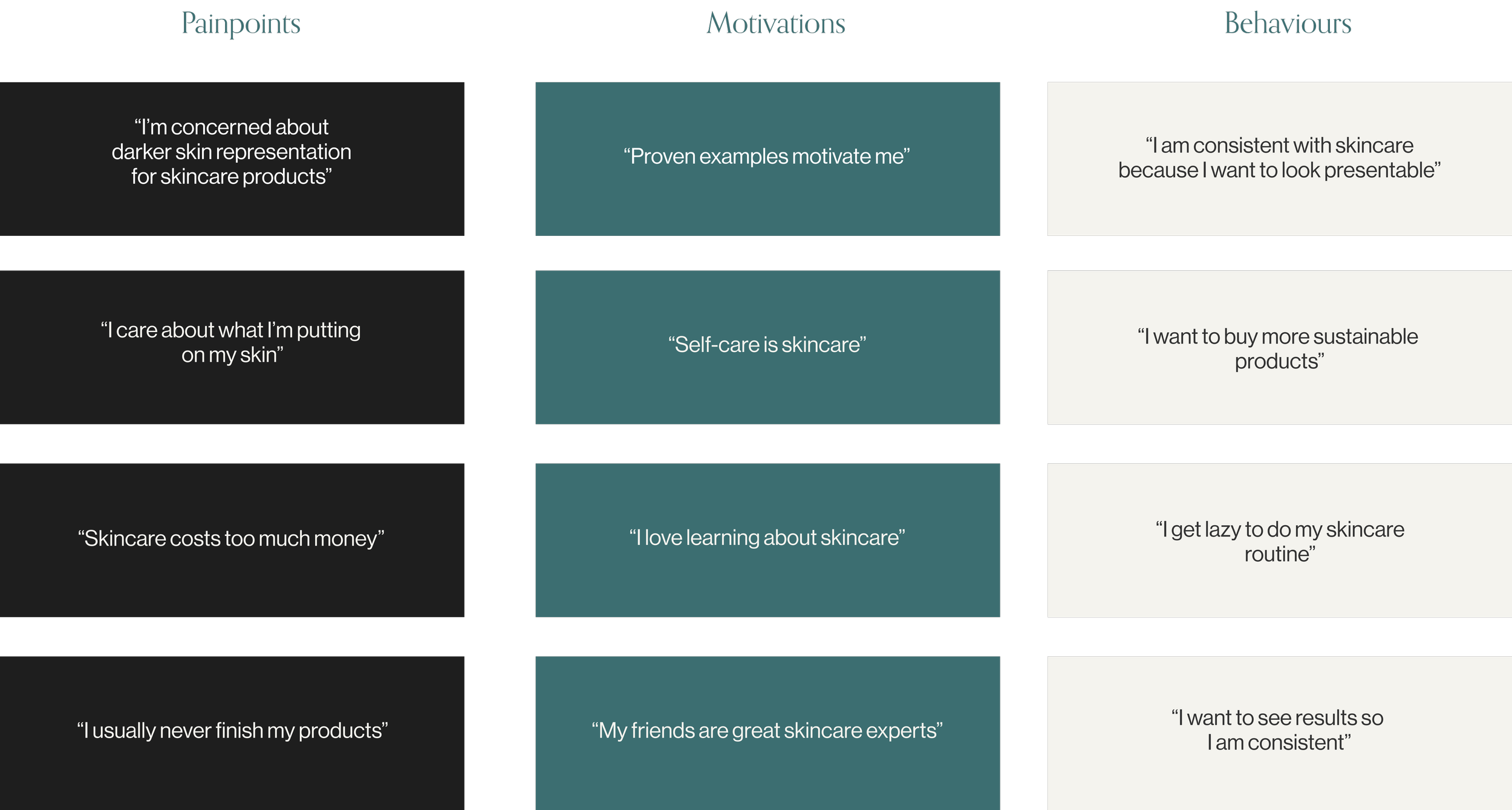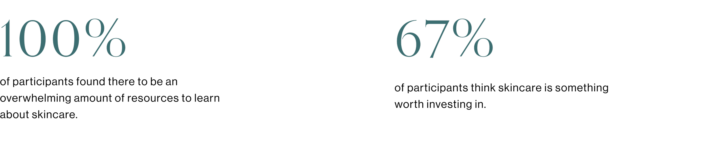 I took the time to interview six individuals and discuss their skincare journeys. Compared to other UX research methods, gathering the insights from this primary research allowed me to understand different users and their individual experiences with skincare.